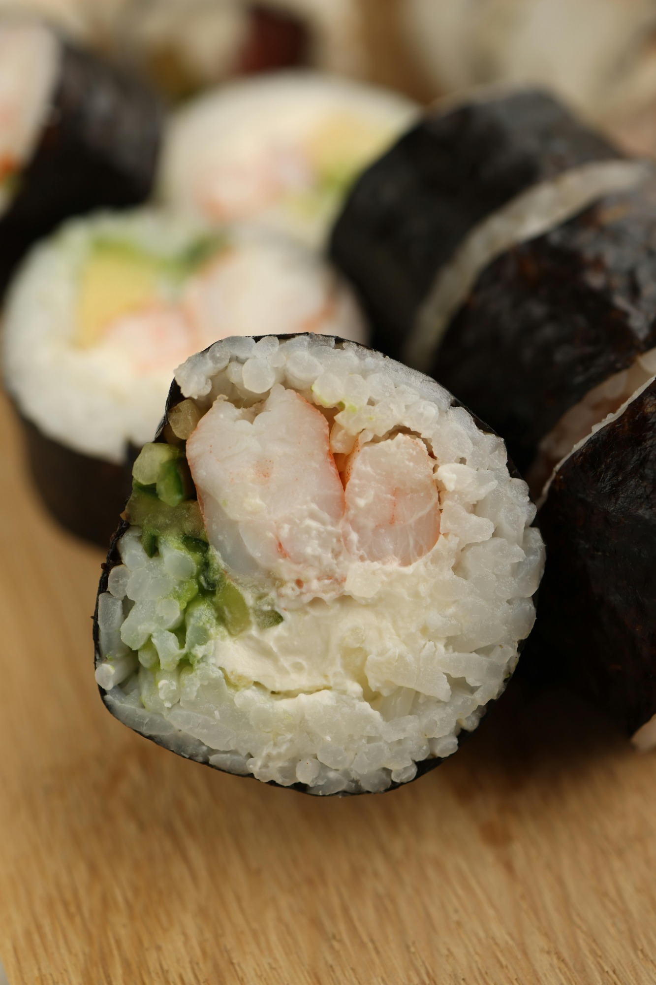 gotowana krewetka, słodki majonez, wasabi, shitake, ogórek, awokodo, tobico -